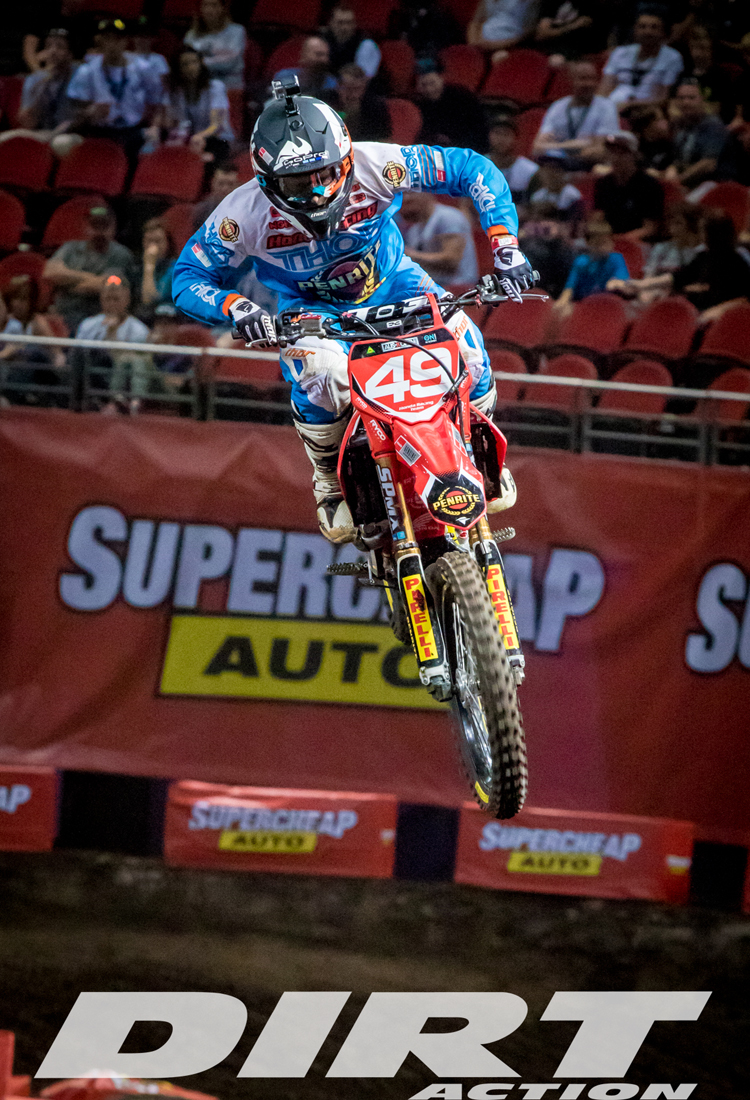 It falls off a little up top when compared to the KXF, KTM and YZ, but for the conditions and tracks we face in Australia that isn’t a major concern. The majority of our tracks have low average speeds and are point-and-shoot affairs, so the low and mid power concentration works a treat.